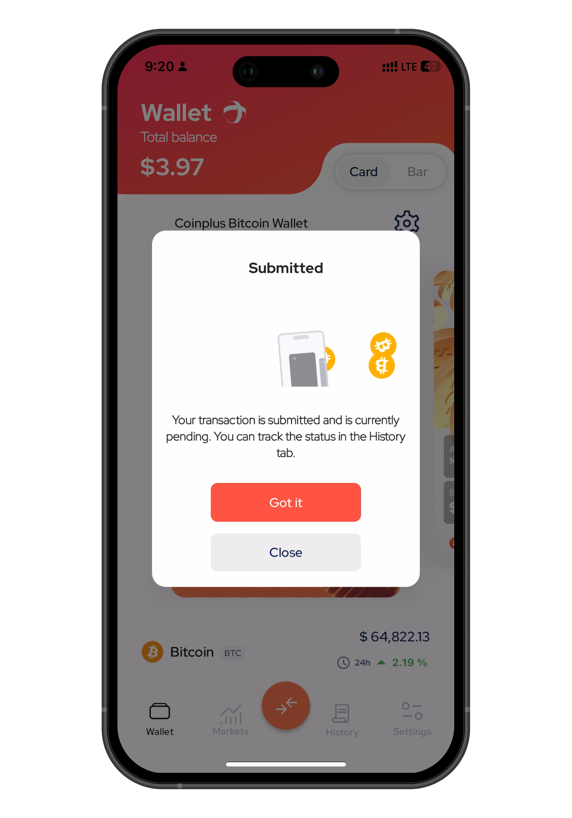 You will see a success message when your transaction is submitted on the network. You can track the status in the History tab.